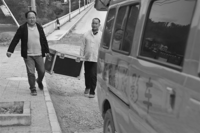 3月19日,在天柱縣坌處鎮(zhèn)三門塘村,黃宜?。ㄗ螅┡c助手王揚(yáng)清搬運(yùn)電影播放設(shè)備。近年來,天柱縣設(shè)立農(nóng)村公益電影補(bǔ)助款,為山區(qū)群眾免費(fèi)播放電影,并利用播放電影的時(shí)機(jī),向群眾宣傳脫貧攻堅(jiān)政策。2018年全年,天柱縣的14個(gè)公益電影放映員,給全縣315個(gè)村播放公益電影3979場(chǎng)。