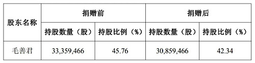 公告顯示,截至披露日,毛善君持有公司股份33359466股,占公司目前總股本的45.76%。為支持北京大學(xué)地球與空間科學(xué)學(xué)院教育事業(yè)的發(fā)展,更好地促進(jìn)其教學(xué)科研和人才培養(yǎng)工作,毛善君與北京大學(xué)教育基金會(huì)于7月2日簽署捐贈(zèng)協(xié)議,一次性向北京大學(xué)教育基金會(huì)無(wú)償捐贈(zèng)其持有的公司股票250萬(wàn)股。