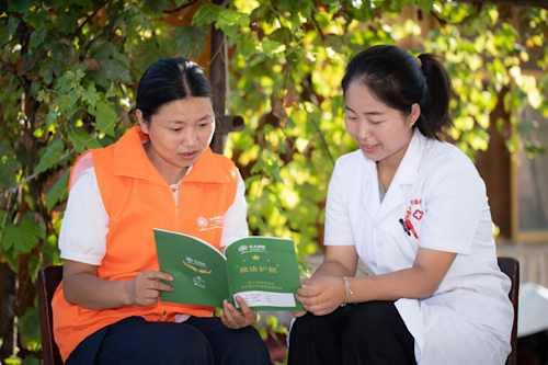 甘肅舟曲縣杰迪村健康互助組志愿者趙風(fēng)霞和村醫(yī)楊海條學(xué)習(xí)健康知識(shí)