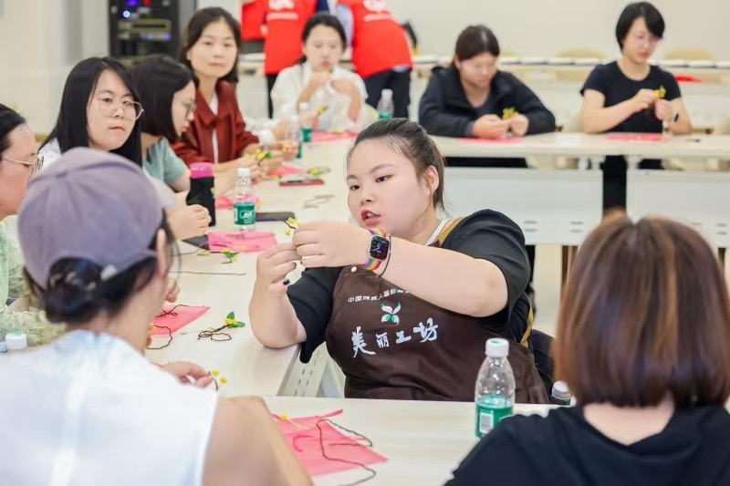 融合工坊環(huán)節(jié)成為活動(dòng)一大亮點(diǎn)。工坊內(nèi),手工文創(chuàng)體驗(yàn)與“匯愛(ài)訂單”跨障礙團(tuán)隊(duì)協(xié)作活動(dòng)同步開(kāi)展。值得一提的是,全部手工指導(dǎo)老師都由殘障人士擔(dān)任,她們?cè)谑止の膭?chuàng)體驗(yàn)中展現(xiàn)出精湛技藝,耐心指導(dǎo)健全人制作杭州亞殘運(yùn)會(huì)的金枝折桂手工胸針。從材料選擇到制作工藝,老師們一步步細(xì)致講解,學(xué)員們認(rèn)真學(xué)習(xí)、積極參與。通過(guò)這種互動(dòng),不僅讓健全人體驗(yàn)到手工制作的樂(lè)趣,更重要的是為殘障人士提供了展示技能的平臺(tái)。而“匯愛(ài)訂單”跨障礙團(tuán)隊(duì)協(xié)作則將活動(dòng)推向高潮,殘障人士與健全人組成團(tuán)隊(duì),共同完成訂單任務(wù)。在這個(gè)過(guò)程中,大家相互配合、發(fā)揮各自?xún)?yōu)勢(shì),打破障礙,攜手共進(jìn),深刻詮釋了殘健融合的理念。這不僅增加了殘疾人的收入,更提升了他們的社會(huì)認(rèn)同感與自信心。