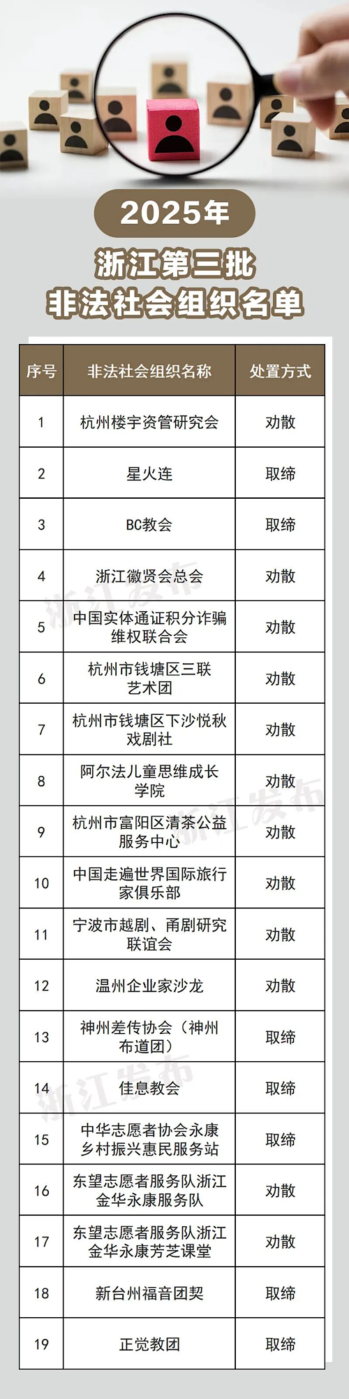 為提高公眾防范意識,充分發(fā)揮社會監(jiān)督作用,常態(tài)化推進(jìn)打擊整治非法社會組織,浙江省民政廳近日公布2025年第三批非法社會組織名單,請社會公眾提高警惕,謹(jǐn)防受騙上當(dāng)。