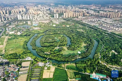 這是在江蘇省常州市拍攝的春秋淹城遺址與武進(jìn)城區(qū)景色(2022年8月6日攝,無(wú)人機(jī)照片)。新華社記者 楊磊 攝