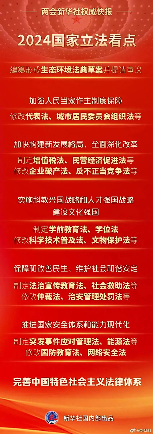 8日提請十四屆全國人大二次會議審議的全國人大常委會工作報告提出,2024年,要認真落實常委會立法規(guī)劃,完善中國特色社會主義法律體系:制定民營經(jīng)濟促進法、學前教育法、社會救助法等,修改城市居民委員會組織法、文物保護法、網(wǎng)絡安全法等。一起來看↓