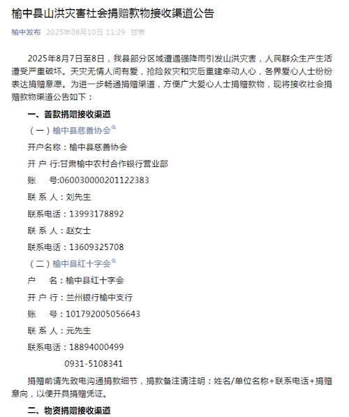 榆中縣山洪災(zāi)害社會捐贈款物接收渠道公告