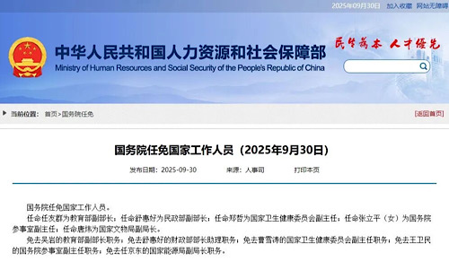 任命任友群為教育部副部長;任命舒惠好為民政部副部長;任命鄭哲為國家衛(wèi)生健康委員會副主任;任命張立平(女)為國務(wù)院參事室副主任;任命唐煒為國家文物局副局長。